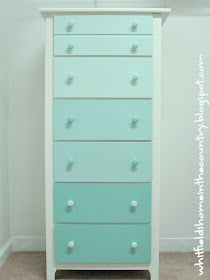 I gave everything 3 coats of paint using the sponge roller, and let it dry really well in between coats. I did 1 coat a day, 3 days in a row. I didn't use a primer on this piece, I didn't feel like I needed too. I will report back on how it holds up. I decided to leave the sides and front a Bright White, and to put some color on the drawers like a paint chip card. I kept the old knobs and painted them the same colors as the drawers but interchanged them. I let it all dry for the full curing time (on label) before I assembled it back together. I think I will use some clear furniture wax on it, (either Minwax, or the Johnson Paste Wax) it will help protect the finish!